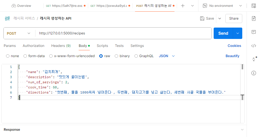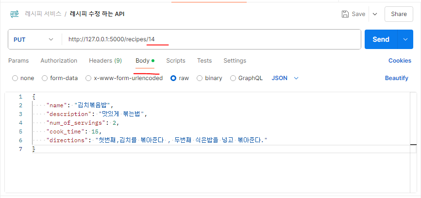 # SELECT 기능에서 이어서 진행! (참고 : https://sorktjrrb.tistory.com/143) # 레시피를 수정(UPDATE) 하는 API를 만들어 보자- 우선, 포스트맨을 실행시켜 PUT으로 설정하고, URL(업데이트할 id값도 같이 입력) 입력!- Body에 raw 선택 JSON 형식으로 DB에 추가하고 싶은 정보를 입력해준다. # VSCode에서 API 코드 작성!- id를 지정하여 가져오는 형태이므로 특정 레시피를 선택했던 class에 이어서 작성 from flask import requestfrom flask_restful import Resourcefrom mysql_connection import get_connectionfrom mysql.connector import..